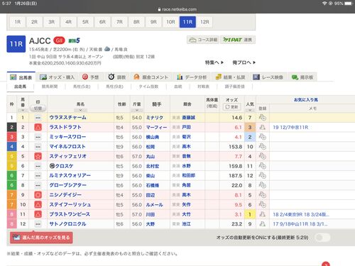 恐ろしいほど不調です。新年から不調の時期が来なくても良いのにと思います。 小倉5R ◉◎◎ベイキングヒート 小倉11R 巌流島特別 イーサンパンサー 中山6R ◉◎◎アルピニズム 京都11R 日経新春杯 ◉アフリカンゴールド いつもは坂路調教の馬を狙って買ってますが…
